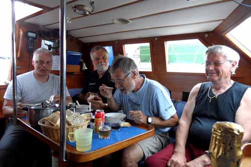 Yhteys saavutettiin kanakeitolla, ei radioilla. White Ladder’in miehistö Iiriksellä. Vas. Harry ”Uimari” Saarimaa, Kim ”Näyttelijä” Floor, Sakari ”Maratoonari” Perkola ja Leo ”Kippari” Kaartinen.