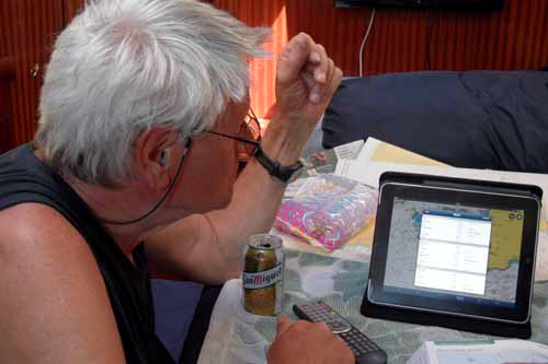 Leo esittelee iPadiään. Mitä pienempi vehje, sitä isompi ihme meikäläiselle, hiilihöyryn jungmannille. Iiriksellä selataan monta kiloa painavaa Reedsin almanakkaa ja lajitellaan kymmeniä kiloja merikarttoja ja pilottikirjoja – turhaan? Tuossa lelussa näyttää olevan koko ”maaliman” viisaus.
