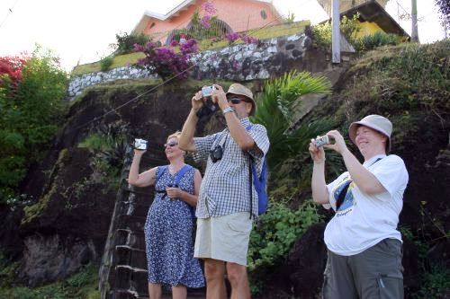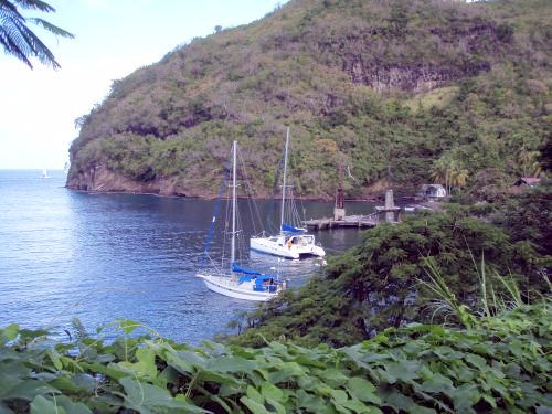 Monille Wallilabou Bay on tuttu paikka. Tai ehkä sitä ei tunnista, vaikka olisi nähnytkin Pirates of The Caribbian-elokuvia. Sitä filmattiin täällä viimeksi 2003. Nyt ei rosvoja näkynyt, sen sijaan venemiehet (boat boys) tulivat joukolla vastaan, lahdelle saavuttuamme. Davis oli sopivalla paikalla kyljellämme sopivaan aikaan, joten hän sai soutaa peräköytemme maihin ja tienasi siitä meiltä 5 USD:n korvauksen. Pari taalaa vähempikin kai riittäisi, mutta itse vielä möhlimme päästämällä peräköyden kokonaan ulos ja pohjaan. Kymmenen muuta pikkuvenettä pyöri hetken ympärillä tarjoamassa, koruja, hedelmiä, kalaa tai opastusta vesiputoukselle. Onneksi muita veneitä oli kaiken aikaa tulossa, joten kauppamiehet katosivat nopeasti kiinnostuneempien juttusille. Vielä on nähtävyytenä rapistuvia ja sortuvia lavasterakennelmia, mutta sataman maisema, palmurantainen lahti vehreän viidakon reunustamana vie ehdottomasti voiton. Venemiespalveluiden lisäksi on pari ravintolaa ja tulli päivittäin klo 1700-1800. Jälkimmäiselle kävimme maksamassa 175 ECD:tä n. 55 USD, sisältäen pääsymaksun maahan 35 EC/hengeltä ja ylityötä. Seuraavan päivän kyläkävelyllä riitti ihmisten rakennusten ja kasvien eksotiikkaa. Kioskin kokoisia, osa kaatumaisillaan olevia kapakoita, samanlaisia asuinmurjuja ja runsaasti erittäin hienoja kivirakenteisia huvilamaisia omakotitaloja valmiina ja eri rakennusvaiheissa.