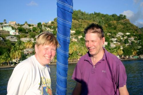 20.1.2008 VesilleVedettiin koukku ylös ja ajettiin polttoainelaituriin. Bensaa otettiinkin 5 litraa, mutta enemmin vettä 200 l, pientä korvausta vastaan. Parin tunnin selvitys- ja kauppa-ajaksi kiinnitimme purjelaivasäätiön käytössä olevan koululaiva Zangran kylkeen. Pian hyvä itätuuli työnteli, kun pujottelimme ulos Le Marinista ankkuroitujen veneiden väleistä kohti merta, joukossa monenlaista haaksea mm. Kuulu Mari-Cha III. Iiris varmaan ihmetteli missä nyt mennään, sillä Timo ajoi käsiohjauksella koko matkan. Auringon juuri laskettua ankkuroimme St.Lucian Rodney Bayn ulkolahdelle laskemalla ankkuri ja purjeet yhtä aikaa. Veneilykulttuuri on mennyt siihen suuntaan, että kone aina käynnistetään satamaan tullessa ja lähtiessä riippumatta olosuhteista. Kyllä se meilläkin aamulla taas pörisi, koska ankkuripelin sähkön tarve täytyy tyydyttää. Veneitä kellui laajalla vesialueella kymmeniä, joukossa täystakiloitu 5-mastoinen (rullaraa'at) ja joitain superjahteja mastoilla ja ilman. Viimeksi tullut lähteköön ensin? Ankkurimme nousi heti kuuden jälkeen yhtä aikaa auringon kanssa. Korkean saaren suojassa kone työnsi oikullisen tuulen apuna. Vasta St. Lucian rantaviivan erkaannuttua reitistämme kohti St. Vincentiä saimme puhtia purjeisiin.